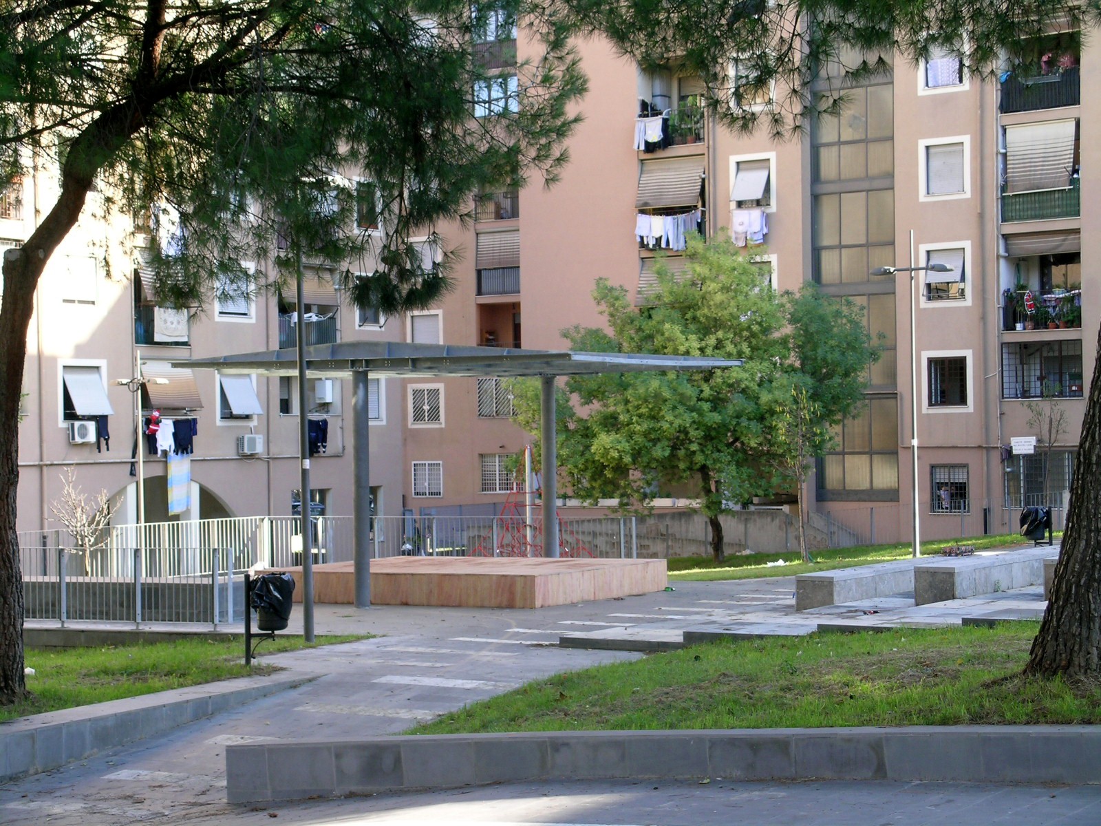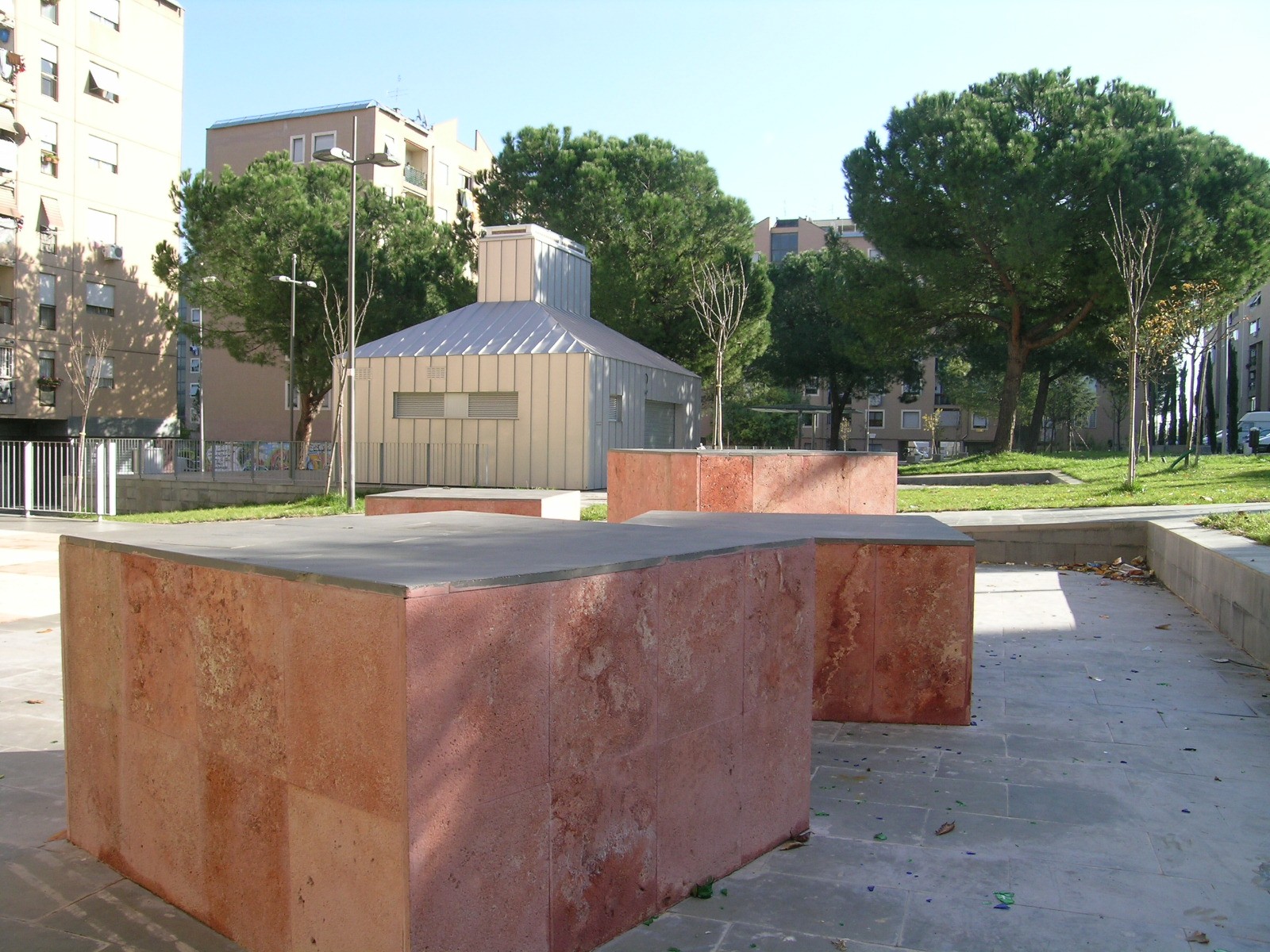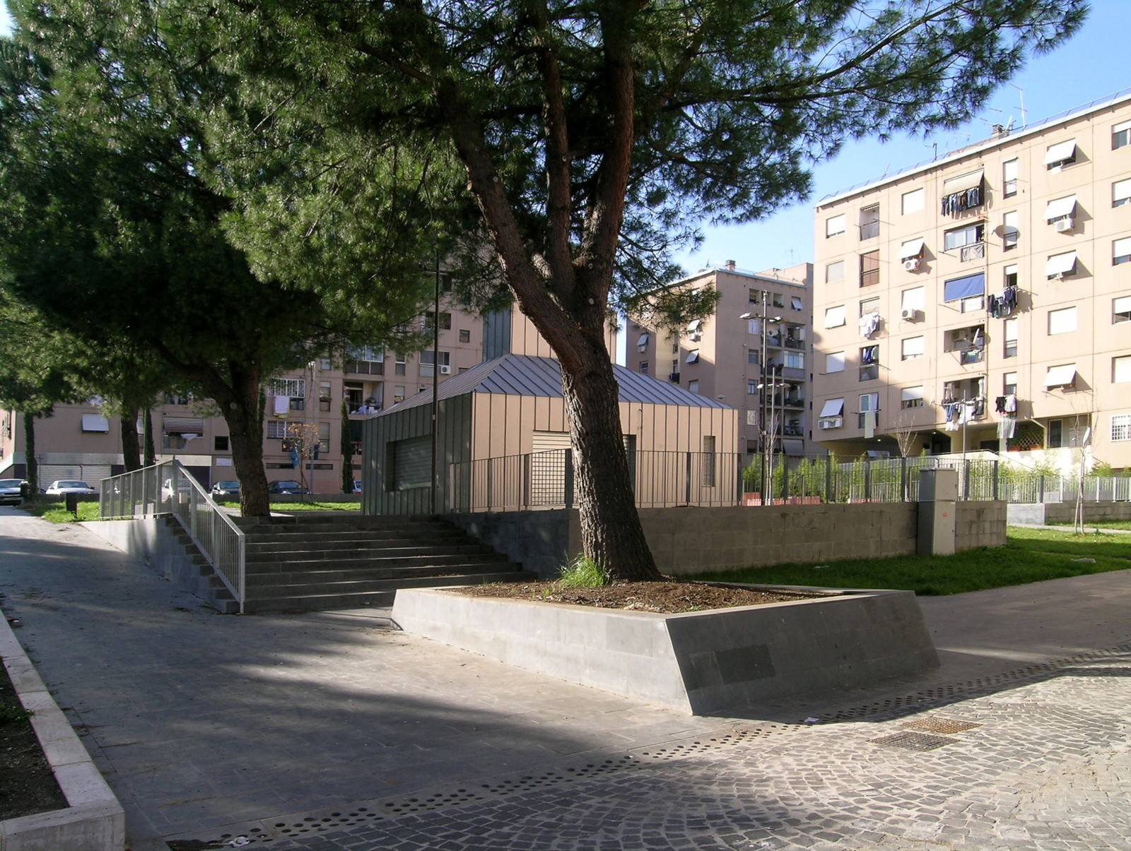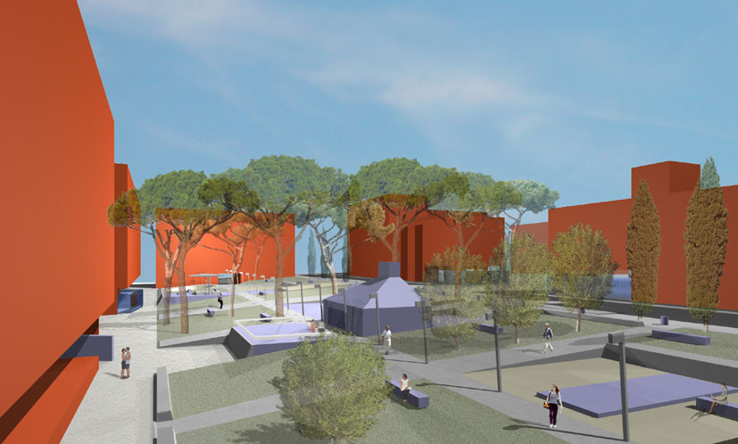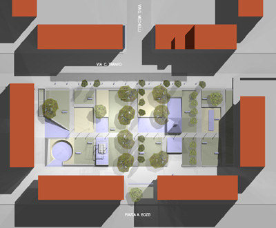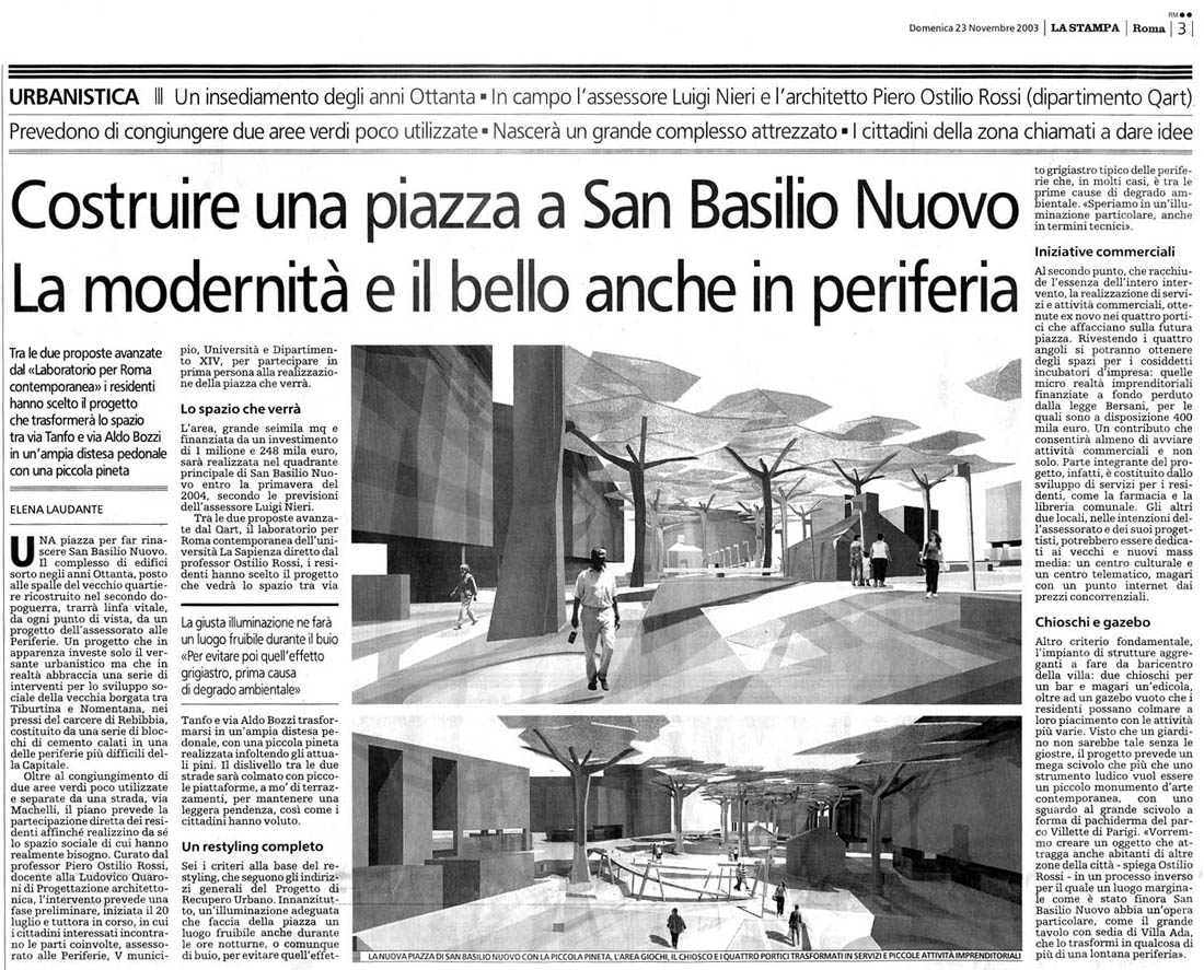 Progetto preliminare, definitivo ed esecutivo di riqualificazione urbana, piazza-giardino e incubatori d'impresa, con la procedura della progettazione partecipata Assessorato alle Politiche per le Periferie, per lo sviluppo locale e per il lavoro L’intervento consiste nella trasformazione delledelimitate da via Carlo Tranfo, via Girolamo Mechelli e due corti semipubbliche piazza Aldo Bozzi in una piazza a carattere urbano interamente pedonale, dotata di tutte le attrezzature necessarie per diventare un luogo di aggregazione, di sosta e d’incontro in un settore del quartiere di San Basilio oggi privo di aree e di servizi d’uso pubblico. Nell’ambito di un intervento integrato tra misure di riqualificazione urbana ed azioni di investimento sociale, il progetto prevede la localizzazione di alcuni incubatori di impresa negli ambienti ottenuti attraverso la chiusura dei portici di tre degli edifici che circoscrivono le due corti. In realtà socialmente difficili e in presenza di un forte degrado ambientale, sinergie di questo genere si sviluppano attraverso la costruzione di un effettivo processo di partecipazione dei cittadini che abbia come finalità non solo la costruzione del consenso nei confronti del programma d’intervento, ma anche la definizione di obiettivi il più possibile condivisi. Per questo, il progetto della nuova piazza di San Basilio Nuovo è scaturito da una serie di incontri attraverso i quali gli abitanti del quartiere hanno analizzato e discusso le diverse proposte ed hanno contribuito ad indirizzarne le scelte di fondo.
